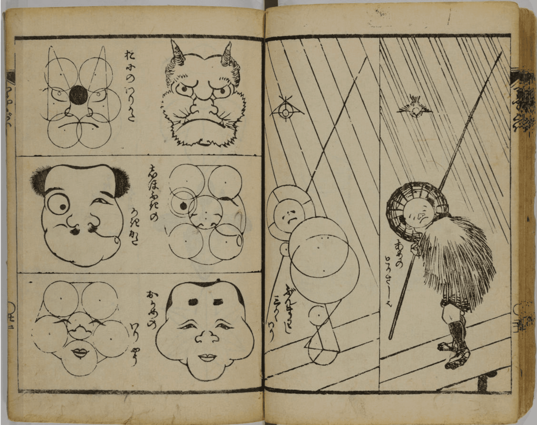 It would be inaccurate to say that the circle is a universal rule of Japanese design. Japanese visual culture and structure is diverse. But seeing such a clear emphasis on circular construction in Hokusai’s teaching manuals is not insignificant.